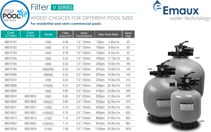 Bình lọc cát Emaux V1000 có nhiều đặc điểm nổi bật. Nó được trang bị van đỉnh 6 chức năng, chất liệu composite nhựa tổng hợp liền khối với sợi thủy tinh gia cố. Bình lọc này có khả năng chống lại tác động của nước biển, nước hồ bơi muối và hóa chất clo. Với lưu lượng lọc là 39m3/giờ và diện tích lọc 0.79m2, nó phù hợp cho cả hồ bơi gia đình và hồ bơi thương mại.Bình lọc cát Emaux V1000 cũng có các ưu điểm vượt trội khác. Nó có khả năng chịu va đập và độ cứng cao, chống lại tác động của tia tử ngoại (UV) và môi trường thời tiết khắc nghiệt. Bình lọc này cũng có khả năng kháng hóa chất và tuổi thọ sử dụng cao.
