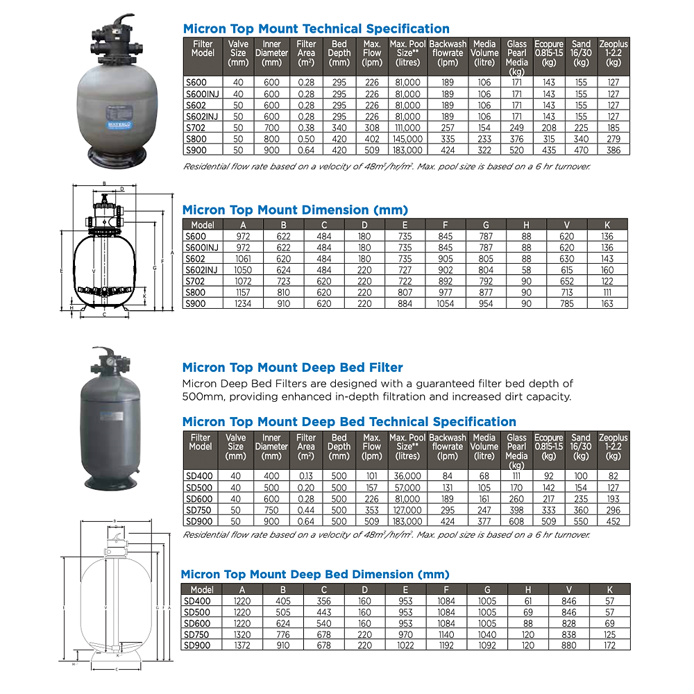 Bình lọc cát hồ bơi Waterco S600 – Công suất: Lưu lượng 226L/m ~ (13.5m3/hr)