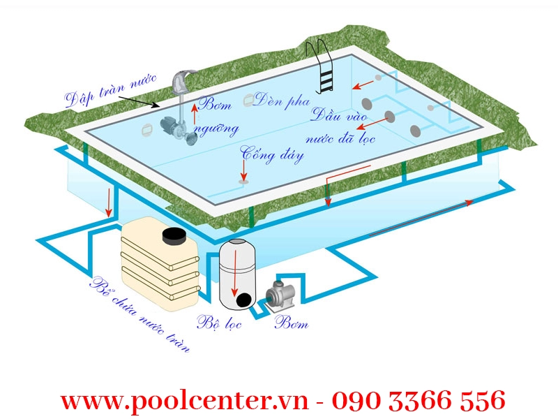 Nước bẩn trong hồ bơi sẽ đi theo hệ thống đường ống dẫn đến hệ thống lọc. Nước được lọc theo trình tự như sau: