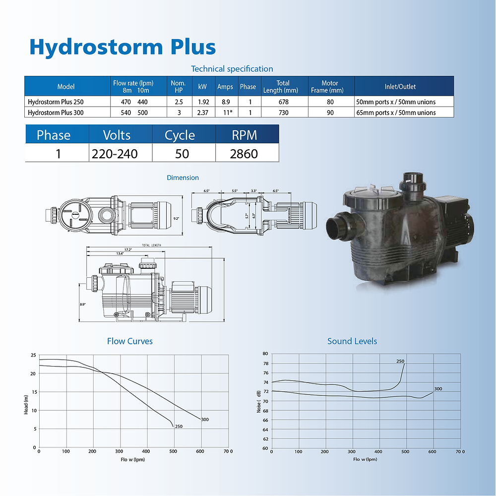 Máy bơm bể bơi Waterco Hydrostorm Plus có các thông số kỹ thuật sau: